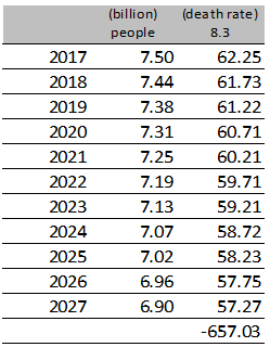 Currently, around 60 million people die and 130 million are born each year, adding 70 million people to the total population number. This level, combined with our way of life, is not sustainable. If we do not do anything, it will certainly push us to extinction.