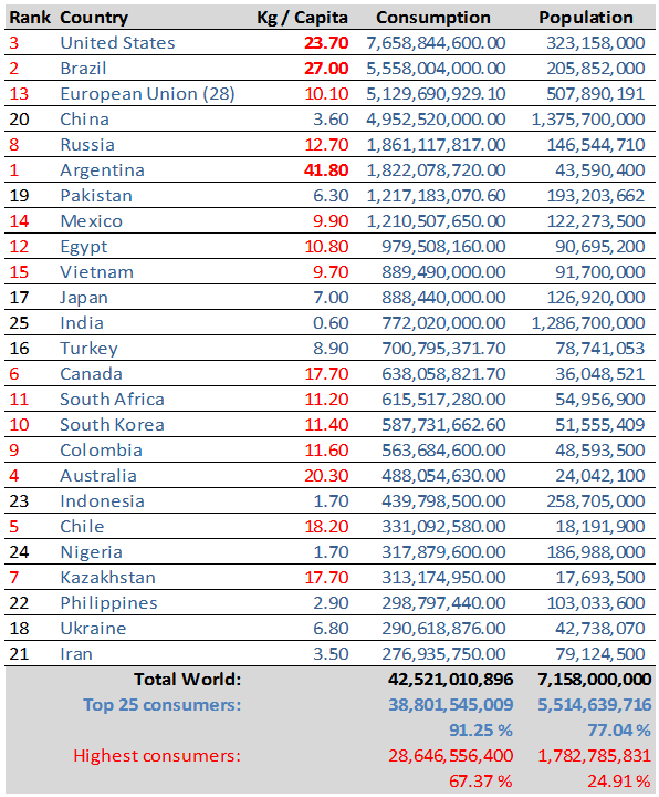 In comparison to other top 24 countries, China has a relatively small beef consumption per-capita, but, because of the large population, overall beef consumption is high, although still almost half the size of the USA’s total consumption. Per capita, China is consuming around 6 times less beef than the United States, although its population is 4 times larger. If China would consume beef at the same rate per capita as the United States, it would consume a total amount of beef equivalent to the other 24 countries combined.
