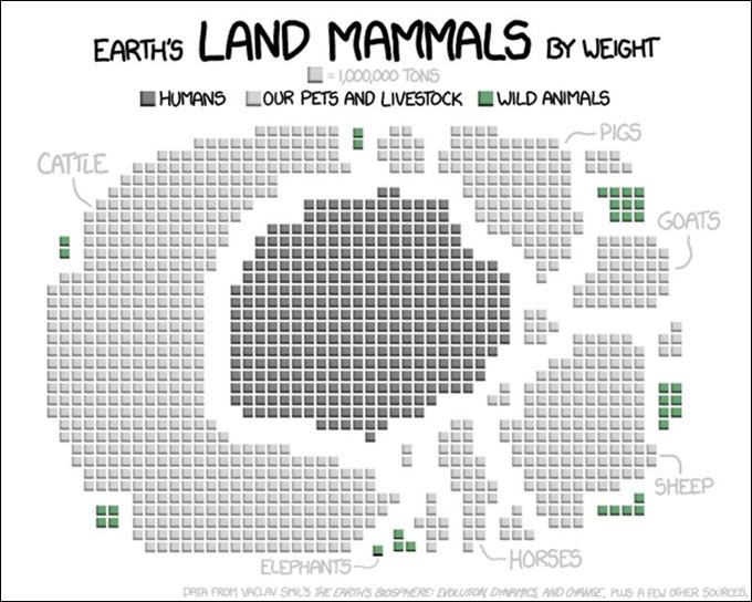 In order to represent the total weight of land mammals, Randall Munroe (author of XKCD) used Vaclav Smil’s *2 book as the data source. His drawing is the simplest representation clearly showing that humans are taking up a significant portion of the entire land mammal mass of the planet, but more important is to notice that most of other animals exist only to serve human dietary needs. Wild animals, in comparison, which can roam freely, make up a very insignificant number. They are marked with green squares.